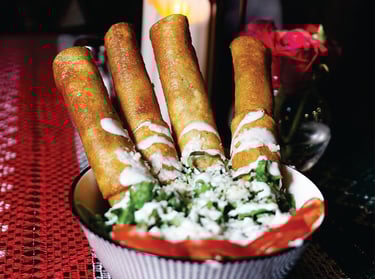 Crujientes Flautas de Pollo Bañadas en Salsa Cremosa Verde, Crema, Queso Cotija. Igual que tus excusas, Repetitivas pero Sabrosas.